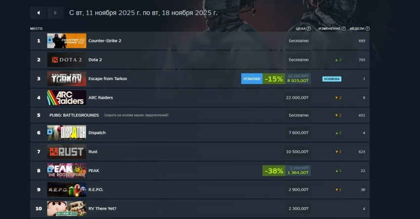 В российском сегменте Steam продолжает доминировать Counter-Strike 2. А единственной новинкой в первой десятке стала Escape from Tarkov, закрывшая троицу лидеров. Также в топе остались ARC Raiders (4 место) и Dispatch (2025)(6 место).