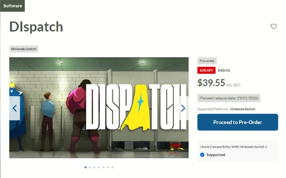 Обложка: скриншот DispatchСупергеройская Dispatch (2025) может выйти на обоих поколениях Nintendo Switch уже 29 января. Информация об этом появилась в австралийском регионе eShop. Согласно магазину, уже сейчас можно оформить предзаказ игры с временной скидкой в 10%. Также покупатели смогут абсолютно бесплатно обновиться до версии для Switch 2.