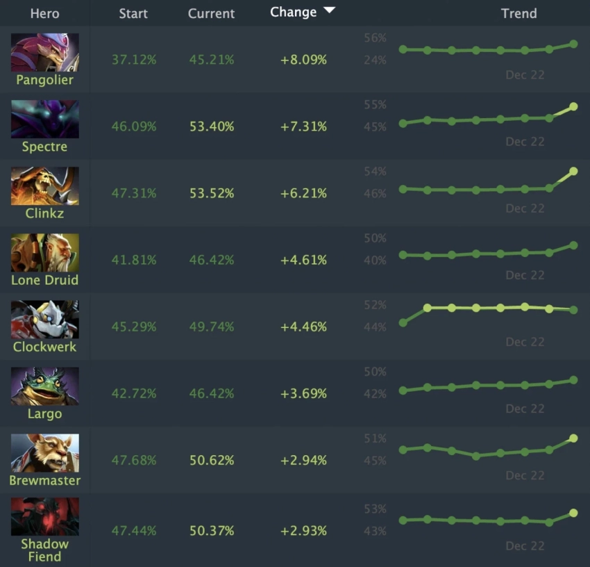 Pangolier: Этот персонаж стал абсолютным рекордсменом обновления. Его доля побед взлетела сразу на 8.09%. Если до выхода патча герой страдал от низких показателей, то теперь его винрейт достиг отметки 45.21%. Хотя это значение всё еще ниже 50%, такая динамика говорит о том, что герой стал гораздо более конкурентоспособным и опасным в прямых руках.