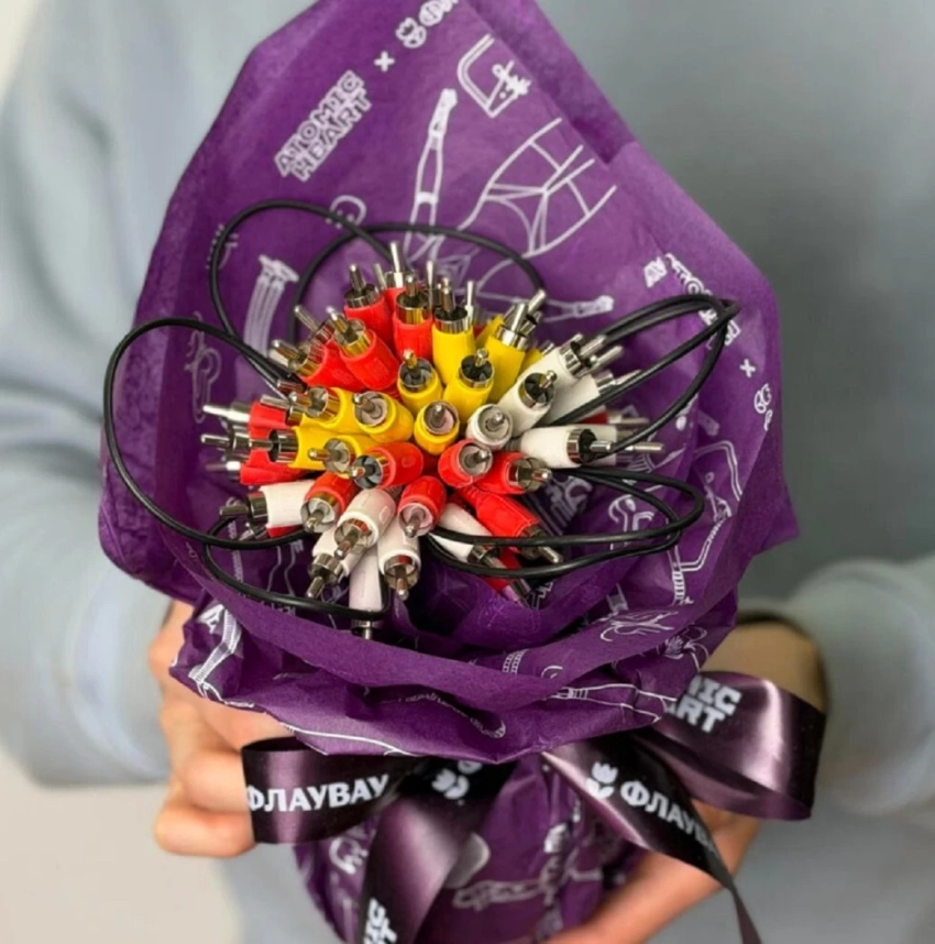 «Когда робот думает о привязанности, он представляет соединения. Надёжные, стабильные и без потерь сигнала. Так появился этот букет из кабелей», — гласит описание «цветов» из проводов.