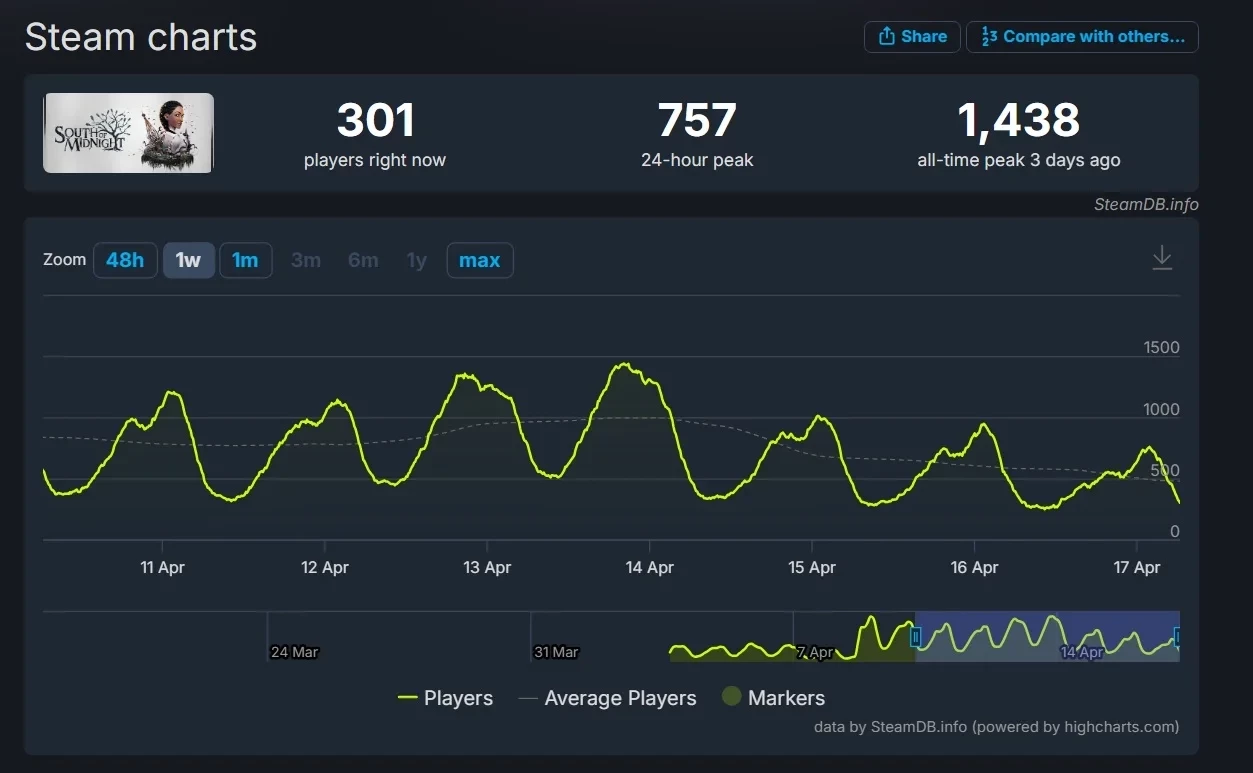 Пиковый онлайн South of Midnight на старте составлял чуть больше 500 человек одновременно. Затем он подрос, но так и не смог преодолеть 1,5 тыс.